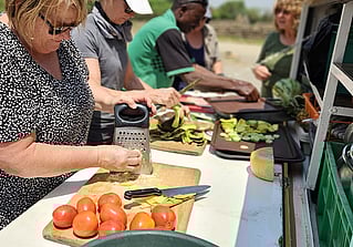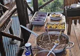 We are renowned for providing wholesome tasty meals using fresh ingredients. We cook outside on charcoal and gas BBQs. Meals are served buffet-style on a main table and we have camp stools to sit on.
