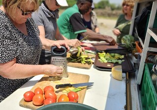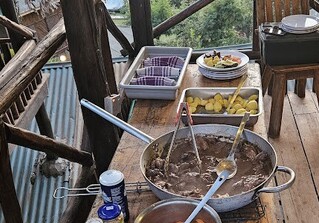 We are renowned for providing wholesome tasty meals using fresh ingredients. We cook outside on charcoal and gas BBQs. Meals are served buffet-style on a main table and we have camp stools to sit on.